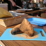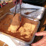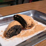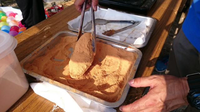 竹炭が練り込まれたコッペパンをその場でサッと揚げ,表面がカリッとなったところで油から上げ,たっぷりのきな粉をまぶして完成です。